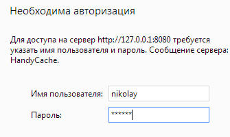 После этого браузер запрашивает «Имя пользователя» и «Пароль», которые я благополучно ввел, используя данные из поля «Доступ» программы HandyCache.