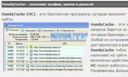 HandyCache — это кэширующий прокси-сервер. Он сокращает трафик до 3-4 раз за счет кэша: однажды загруженные страницы (файлы) записываются в кэш и при следующем запросе берутся из кэша, а не из Интернет — за счет этого экономятся и трафик и время загрузки. HC может кэшировать любые файлы переданные по HTTP протоколу — даже те, которые браузеры не кэшируют.